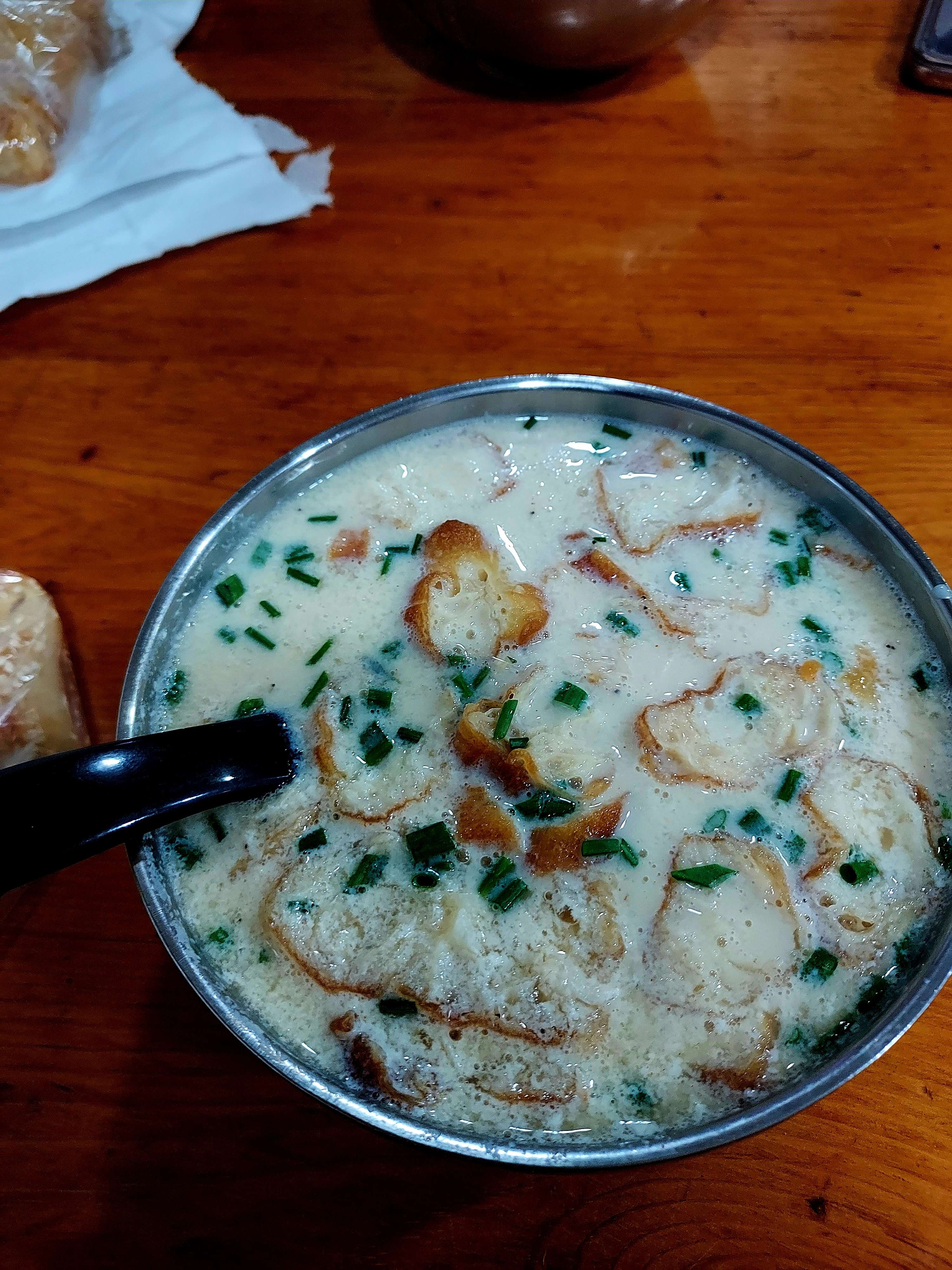 這一餐也算是我的鹹豆漿初體驗,雖然說之前就聽過它的名諱,但一直都不太敢嘗試,他們的鹹豆漿並沒有結塊,要結塊應該要點鹹豆花,豆漿的話就像很碎的豆花屑屑飄著,我覺得吃起來很鹹,但 Jo 說這是小巫見大巫,可能長庚那邊的更恐怖?其實我點的是鹹豆漿加一份甜燒餅,想說一甜一鹹可以中和一下,不過老闆給我鹹燒餅,那一餐我覺得我要脫水了