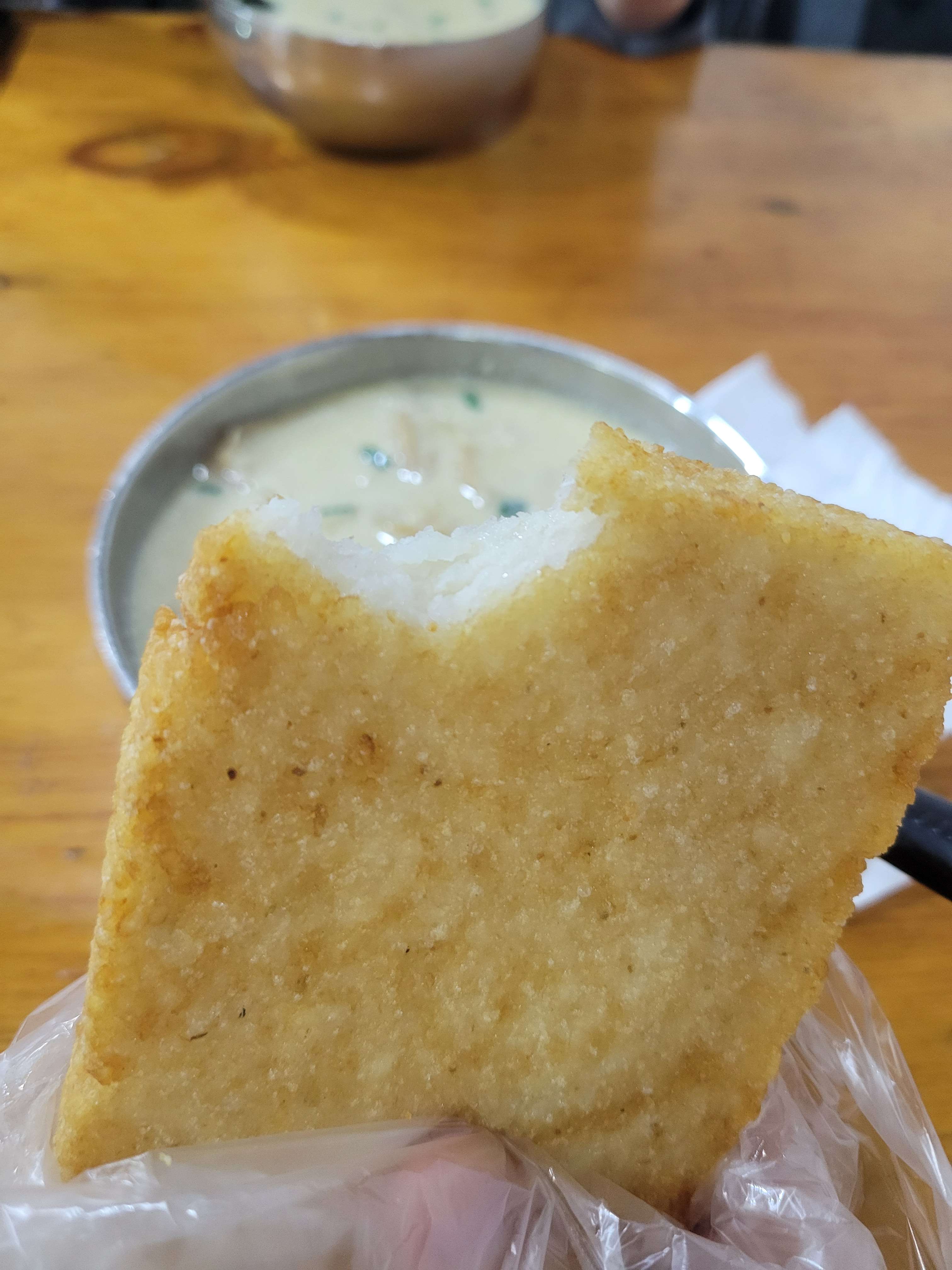 這一餐也算是我的鹹豆漿初體驗,雖然說之前就聽過它的名諱,但一直都不太敢嘗試,他們的鹹豆漿並沒有結塊,要結塊應該要點鹹豆花,豆漿的話就像很碎的豆花屑屑飄著,我覺得吃起來很鹹,但 Jo 說這是小巫見大巫,可能長庚那邊的更恐怖?其實我點的是鹹豆漿加一份甜燒餅,想說一甜一鹹可以中和一下,不過老闆給我鹹燒餅,那一餐我覺得我要脫水了